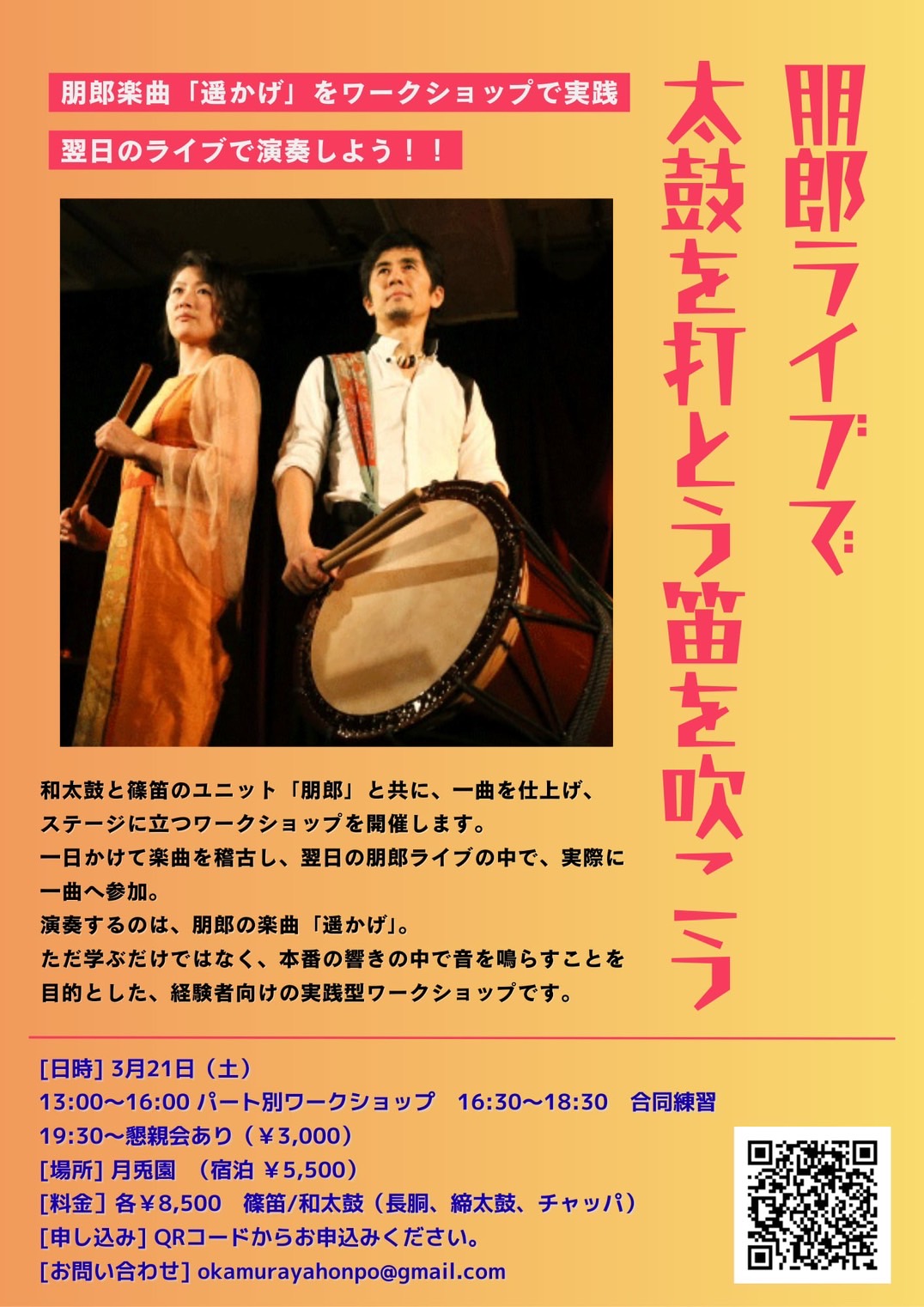 ※和太鼓と篠笛のユニット「朋郎」と共に、一曲を仕上げ、ステージに立つWSです。一日かけて楽曲を稽古し、翌日(22日)の朋郎ライブの中で演奏参加。ただ学ぶだけではなく本番の響きの中で音を鳴らす事を目的とした経験者向けの実践型WSです。